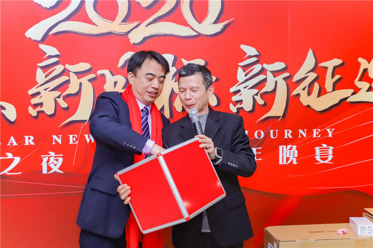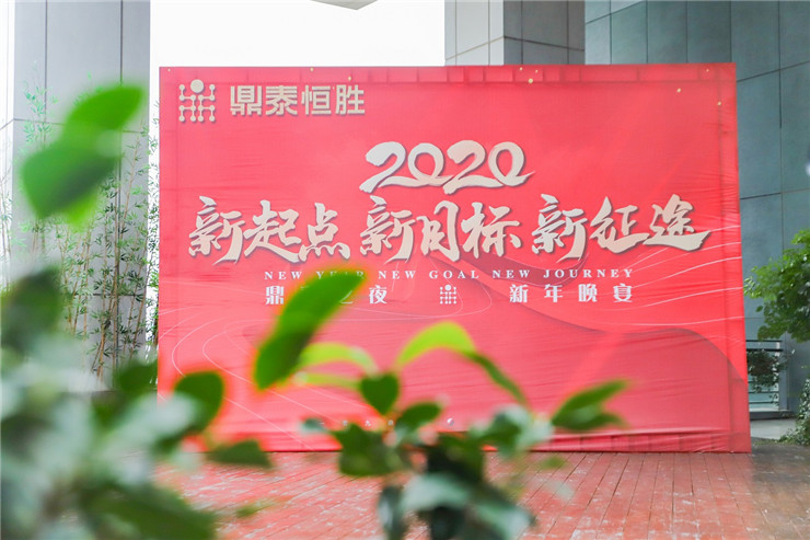 鼎泰之夜新年晚宴场面布置花了一番心思,写着“2020,新起点,新目标,新征途”标语的巨大合影背景墙,十分引人注意。
